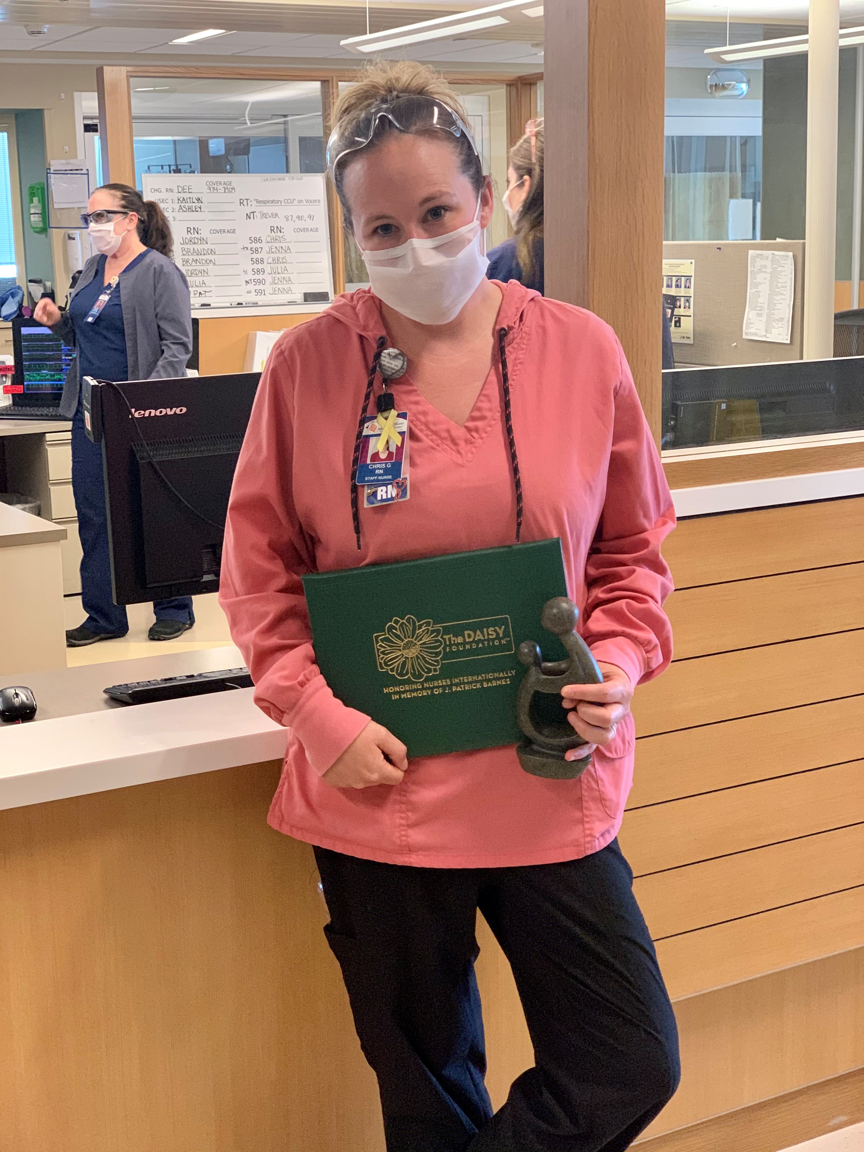Chris cares for the most challenging patients on the Cardiac Care Unit with love and dignity. According to a co-worker, “Chris is always positive and kind to every single person she meets. She radiates love and caring and serves as a role model for even senior nurses on our unit. I am really proud to work with Chris. There are so many reasons and specific scenarios I could write... but I will just say that Chris is so dedicated to her unit, this hospital, and the community. She encompasses what it is to be a nurse and she lives it every day. Chris has the heart of a nurse.”